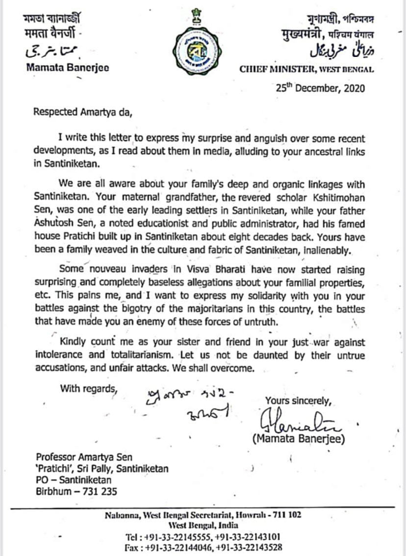 Days after the Centre-undertaken Visva Bharati University authority had mentioned Amartya Sen's name in its list of illegal occupants on the Santiniketan campus, Mamata Banerjee on Dec 25 wrote a supportive letter to Sen, expressing her "surprise" and "anguish" over the development.