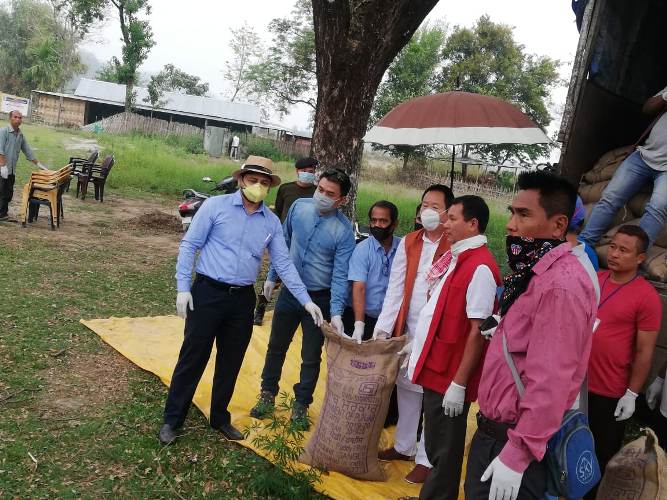 The Airports Authority of India (NER) is distributing rice to daily wagers, workers and similar group of peoples near by the vicinity of Hollongi Airport project.
