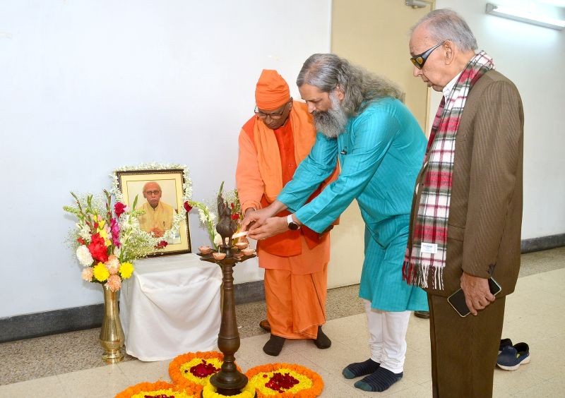 Sraddhalu Ranade , Swami Suparnananda Maharaj and Dr. Subir Chowdhury light the ceremonial lamp in memory of Prof. SK Chakraborty. Photo: PR Team