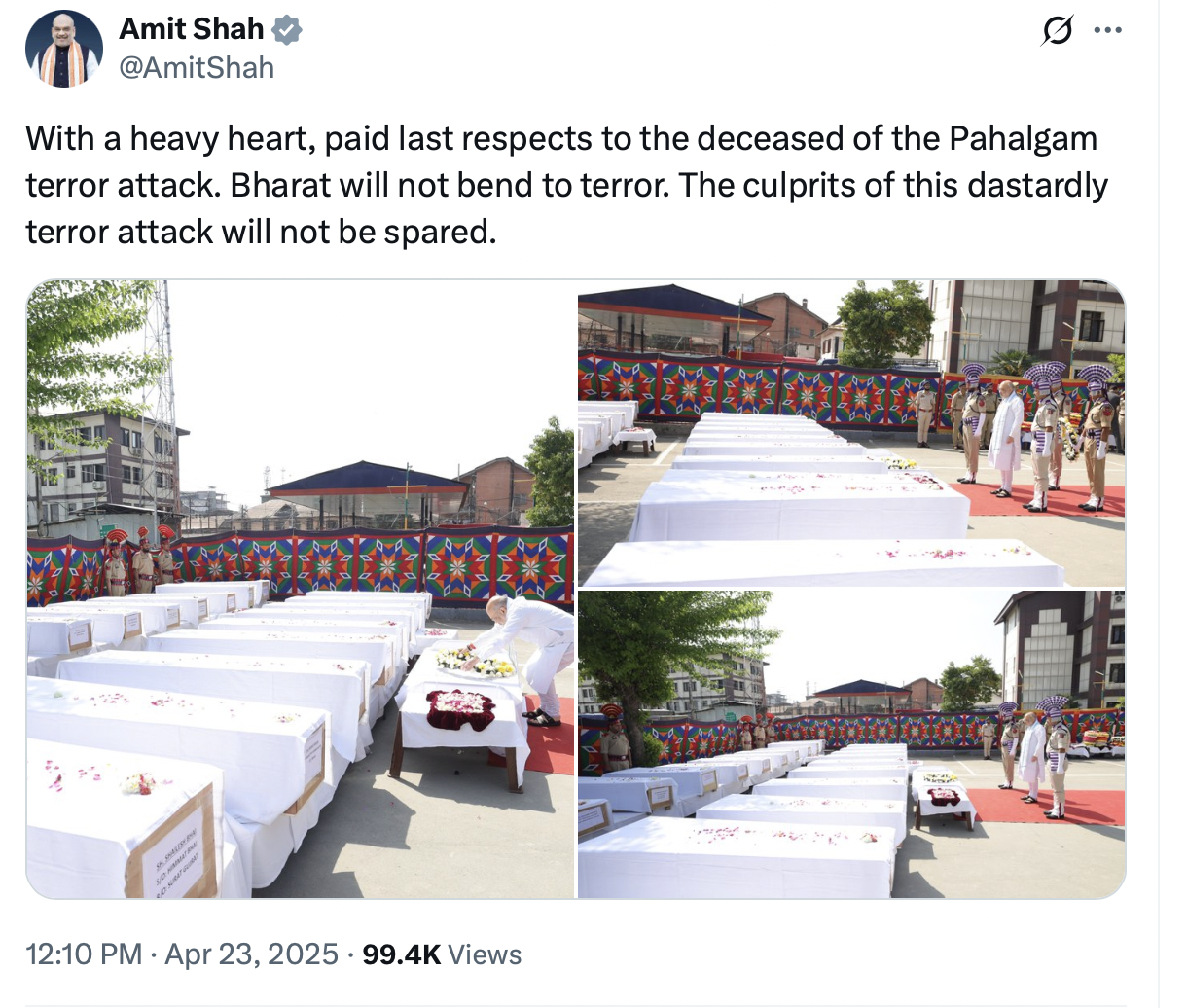 Home Minister Amit Shah, who is in Kashmir taking stock of the situation and visited the scene of the carnage, wrote on X: "With a heavy heart, paid last respects to the deceased of the Pahalgam terror attack. Bharat will not bend to terror. The culprits of this dastardly terror attack will not be spared."
