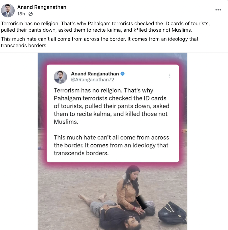 Scientist and author Anand Ranganathan making a caustic remark said, "Terrorism has no religion. That's why Pahalgam terrorists checked the ID cards of tourists, pulled their pants down, asked them to recite kalma, and killed those not Muslims. This much hate can’t all come from across the border. It comes from an ideology that transcends borders."