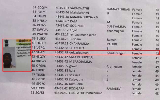 The document identifies Deivasigamani as a 42-year-old woman from Tamil Nadu, but the news channel found out that Deivasigamani is a man.