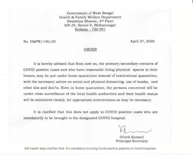 Kolkata/IBNS: Hours after Mamata Banerjee on Monday purportedly said 'home quarantine' for Coronavirus patients is the ideal situation presently, the West Bengal Health Department has clarified in an order that COVID-19 positive cases have to be 'mandatorily' brought to designated hospitals while the primary and secondary contacts can be in home isolation.