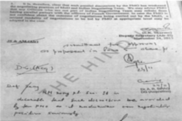 The Defence Ministry's objection has been quoted by The Hindu, "We may advise PMO that any Officers who are not part of Indian Negotiating Team may refrain from having parallel parlays [parleys] with the officers of French Government,” it suggested that “in case the PMO is not confident about the outcome of negotiations being carried out by the MoD, a revised modality of negotiations to be led by PMO at appropriate level may be adopted in the case.”