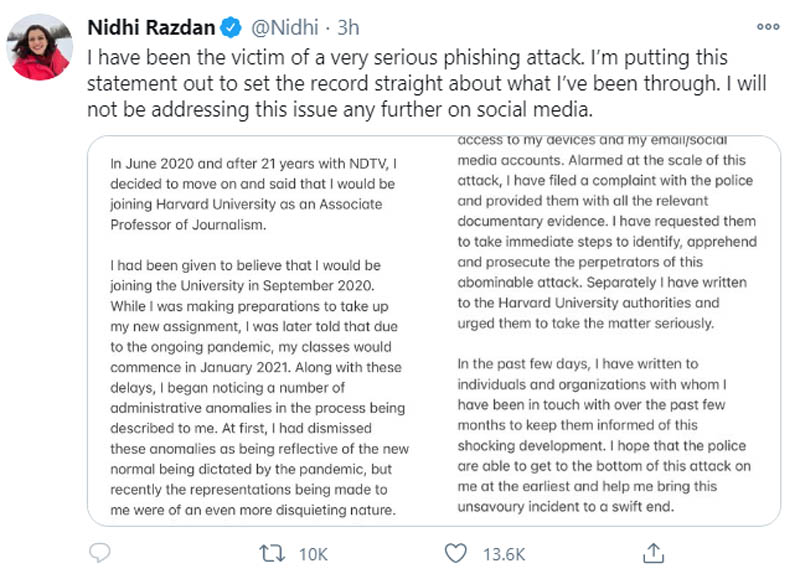 Ex-NDTV journalist Nidhi Razdan now claims her Harvard offer was fake, a 'very serious phishing attack'