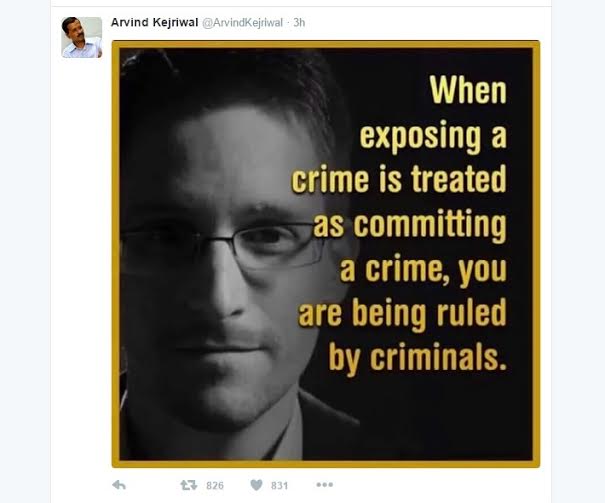 Image: Twitter post of Arvind Kejriwal (twitter.com/ArvindKejriwal)His second picture is a pictorial message of Edward Snowden condemning the dictator-like rule of a country.