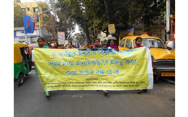 Bharati Dey, mentor of DMSC, in her speech shared the past experience of Durbar's and Endeavour's fight since 2015 against the exploitative tactics of ‘Adhyatmik Ishwarya Vishwa Vidyalaya’ (Spiritual University), which they slammed as 'skilled in duping girls and women to run an institute for sexual exploitation of women'.