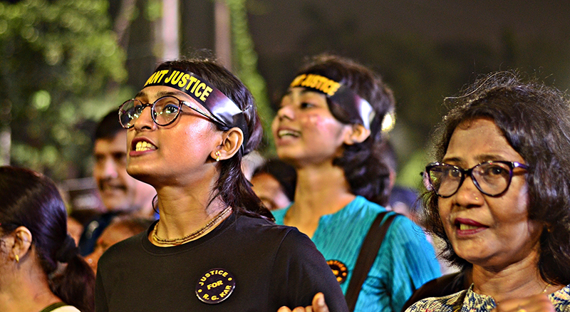 Kolkata/IBNS: Even as the festive season of Durga Puja is knocking on the doors, the cry for justice for the junior doctor, who was brutally raped and murdered in RG Kar Medical College and Hospital on August 9, is far from dying down. Kolkata stood witness to another round of mega protests in demand for justice on Tuesday, which marks the eve of Mahalaya, an auspicious day for the Bengali community.