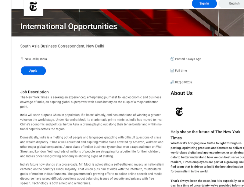 New York Times's opinionated ad for hiring India-based business correspondent raises hackles