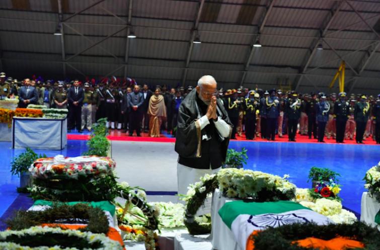 New Delhi, Feb 15 (IBNS): Prime Minister Narendra Modi this evening paid his respects to the 40 fallen CRPF jawans in Thursday's Pulwama terrorist attack after the bodies reached Delhi.