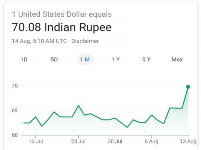 Mumbai/New Delhi, Aug 14 (IBNS): The Indian currency touched the record low on Tuesday with one US dollar corresponding to Rs. 70 08, media reports said.