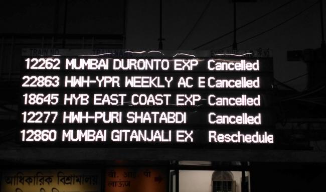 Senior railway officials said that several express, passenger, EMU (suburban) and MEMU local trains had been cancelled or rescheduled or short terminated in South Easter Railway's Howrah-Santragachi-Kharagpur division.