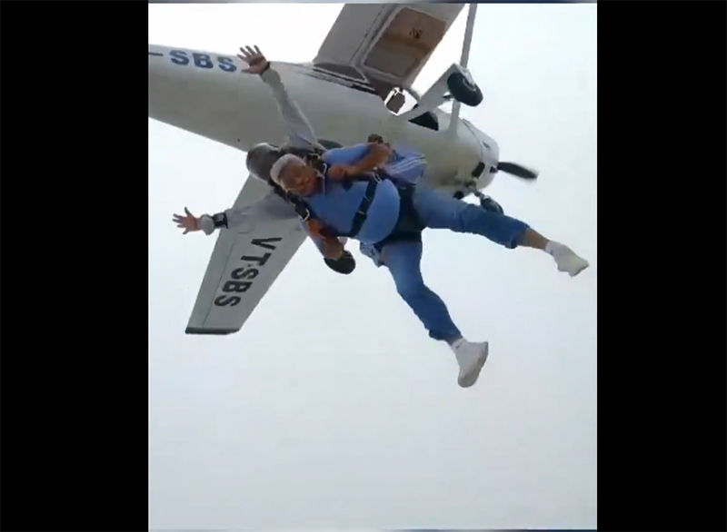 Union minister Gajendra Singh Shekhawat skydives on World Skydiving Day; launches skydiving aircraft.