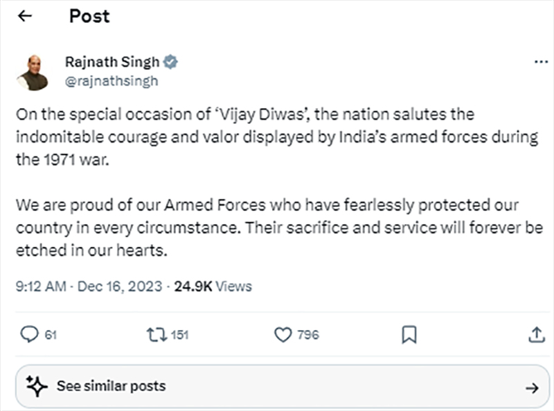 Defence Minister Rajnath Singh said on X, "On the special occasion of ‘Vijay Diwas’, the nation salutes the indomitable courage and valor displayed by India’s armed forces during the 1971 war.