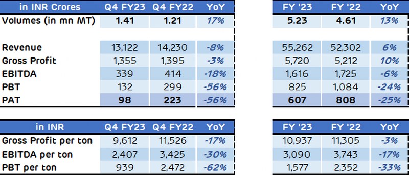 In FY23, the company recorded a 14% growth in volume and a 7% growth in revenue for the year at Rs 58,185 crore. Profit After Tax for the period stood at Rs 582 crore, down 28% against Rs 804 crore in FY22.