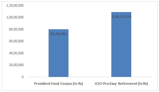 Mr. Suresh, a 35-year old IT professional,contributes 12% of his basic salary,i.e., Rs3000, to the provident fund. If he also invests15% of his annual income, which is Rs12,00,000, for his retirement in a ULIP retirement plan, he would be able to build a much bigger corpus than what he will get from the provident fund account at the age of 60, as shown below:-