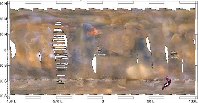 NASA's two other orbiters -- 2001 Mars Odyssey and MAVEN (Mars Atmosphere and Volatile Evolution) -- also provide unique science views. Odyssey has an infrared camera called THEMIS (Thermal Emission Imaging System) that can measure the amount of dust below it; MAVEN is designed to study the behavior of the upper atmosphere and the loss of gas to space.
