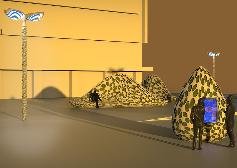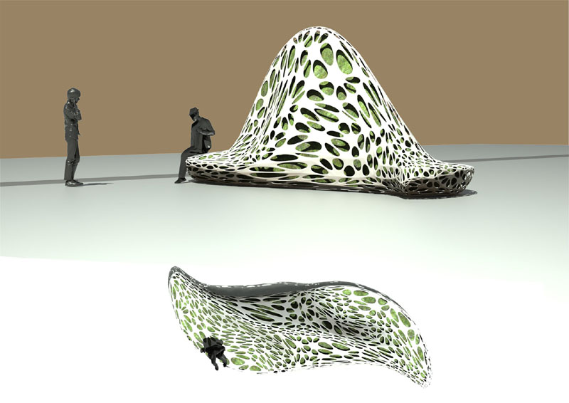 Consisting of an outdoor seating installation, street lighting and a pollution-measuring station, Dominik’s air filtration system is designed to bring down emissions by capturing and recycling carbon via the moss that covers its component parts.