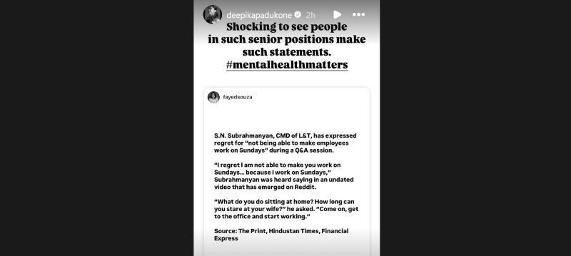 Bollywood actress Deepika Padukone also joined the discussion, criticising the L&T chairman for disregarding mental health.
