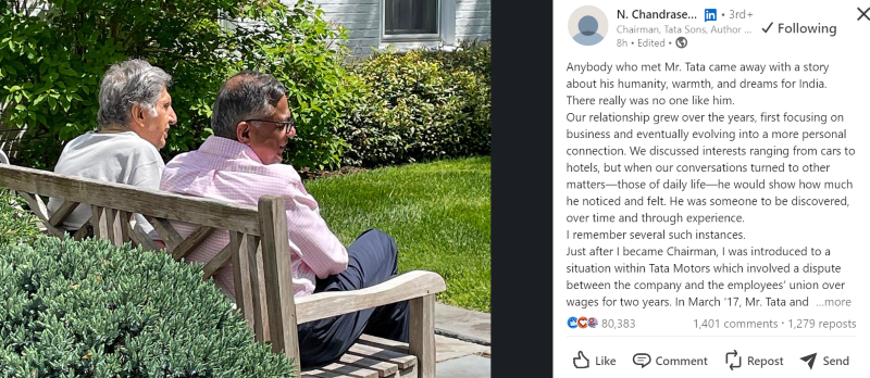 In more such outpourings, Tata Sons chairman N Chadrasekaran penned a heartfelt note for the man, who has left a legacy for others to follow in the coming decades.