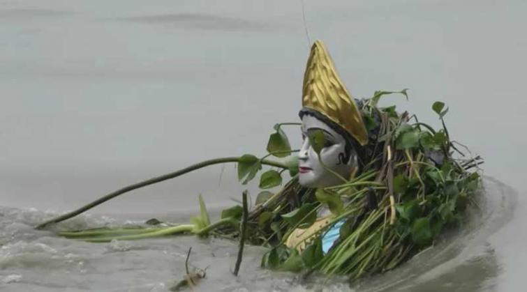 The rising water has touched the face of Lord Vishnu statue sitting on Sheshnag placed on the vertical pillar located in the Brahmaputra river in Guwahati near the Chakreshwar temple.