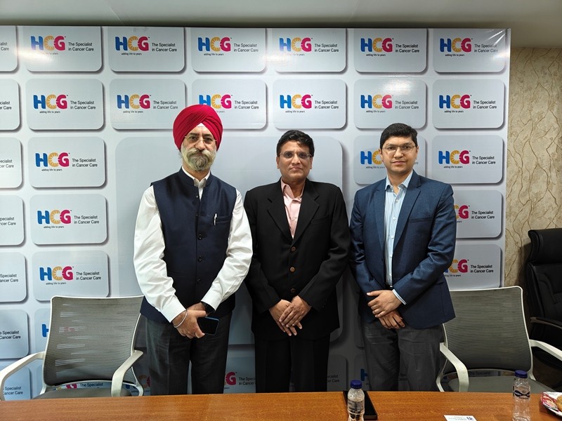 Dr. Rupali Basu, Regional Business Head, HCG Cancer Centre, with Dr. Aggarwal and COO Gurvinder Singh at the press meet. Photo: IBNS