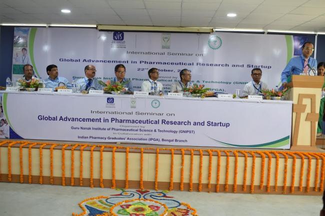The dignitaries of the seminar were present Siddhartha Saran Ghosh (Assistant Professor, Dept. of Internal Medicine, Division of Nephrology, VCU Medical Centre, Richmond, Virginia, USA); Ashok Kumar Mitra (Consumer Product Development and Open Innovation Catalyst, Your Encore Lynchburg, Virginia, USA); Biswajit Mukherjee (Head of Department, Department of Pharmaceutical Technology, Jaddavpur University, Kolkata); Atul Kumar Nasa (All India President, IPGA), B C Mal (Vice- Chancellor, JIS University) and among others.