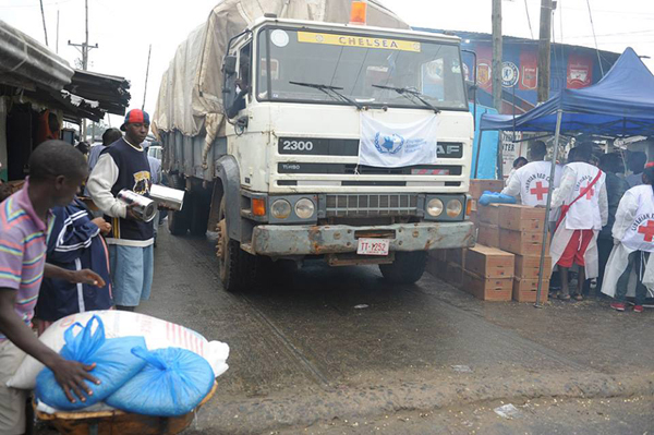 A WFP convoy with needed food supplies entering West Point in Monrovia, Liberia, a community quarantined to prevent the spread of Ebola. Photo: UNMIL/Emmanuel Tobey