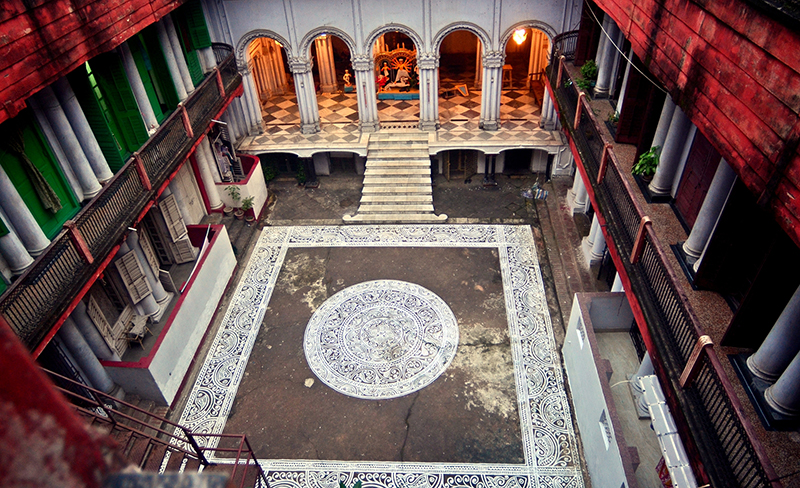 Lensman Avishek Mitra captures glimpses of pre-puja portraits of two north Kolkata family pujas- Girish Park Shymal Dhan Dutta Bari and Girish Park Raj Krishna Mitra Bari. The latter has come up with an elaborate alpona, the Bengali folk art design on the floor consisting of motifs, patterns, and symbols.