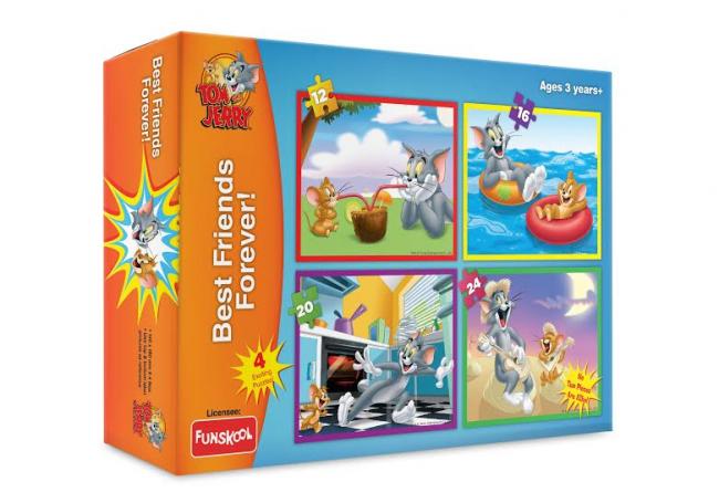The ‘Tom & Jerry Friends Best Forever’ puzzle box contains 4 puzzles with 12,16,20 & 24 pieces respectively.