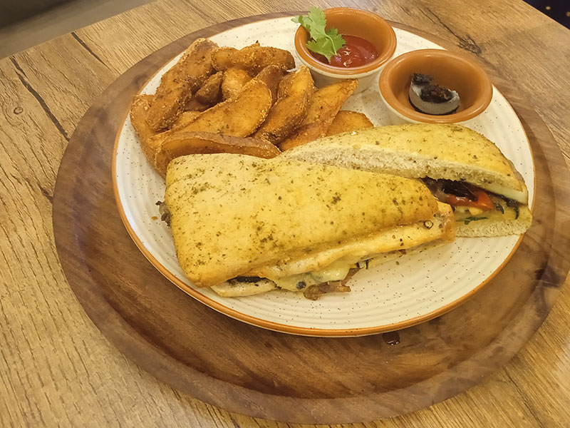 The menu is exhaustive as are the products…burgers and sandwiches, rolls and wraps, pizzas, pastas, baked veg biryani, noodles, pastries, brioche, muffins, breads, cookies and so much more!