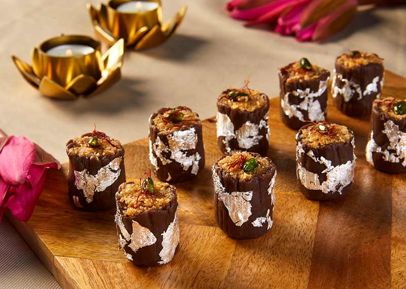 These crafted custom-made hampers offer a selection of pralines, Indian sweets, assorted nuts, signature desserts, along with wine, champagne and designer diyas.