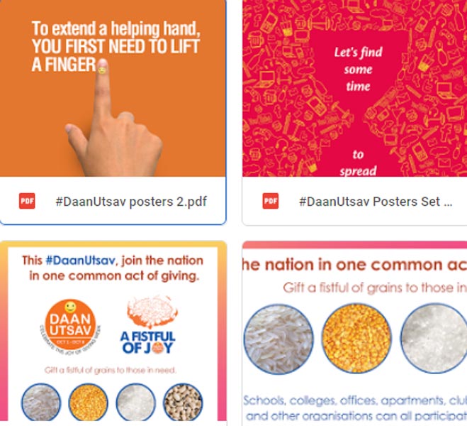 One can celebrate Daan Utsav the way one wants. Individuals do small acts of giving across the country. Corporate Houses organize volunteering and ‘Giving’ activities, with their employees and customers, NGOs organize awareness or fund-raising events, housing societies visit or invite orphanages or elderly homes or throw a party for their drivers, maids and watchmen. Schools and colleges encourage students to volunteer and many individuals, including celebrities, do their little bit in whatever way they can.