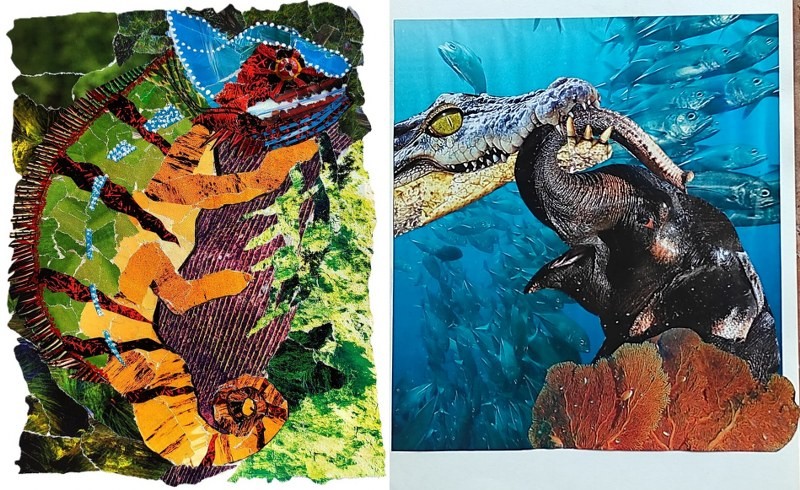 When you do collages as just art, you have a lot of freedom of thought. But when these are to illustrate your story, fidelity to the context is crucial. For example, Quillo, the baby hedgehog, is growing. When hedgehogs are very young, their quills are mostly soft and white. Then these gradually turn to light, then deep brown, strong, and prickly. As he grows, the depiction changes accordingly. He looks the strongest, and most adult, in his last image, with Silver.