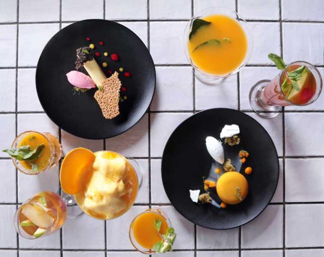 Or, indulge in the many textures of the Mango Cremeux, made with black sesame sponge, raspberry sorbet, green tea crumble, sesame nougatine, and raspberry gel.
