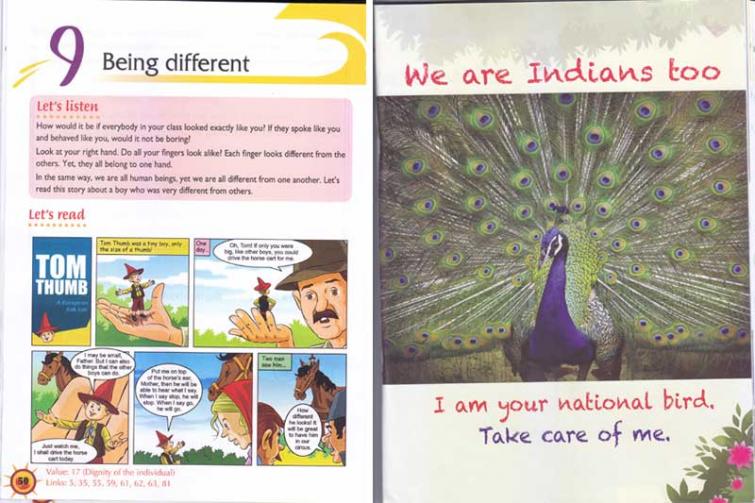 This style of values education is maintained throughout as the lessons progress into higher classes with instances appropriate for the age-groups. The Class 2 book, for instance, contains chapters like ‘Respecting others’, ‘Being different’ with a comic strip based on Tom Thumb, the folk- tale figure. He is short and tiny, i.e. different, but he also has his strong points and can contribute to society.
