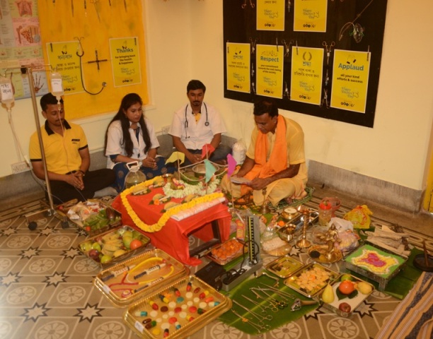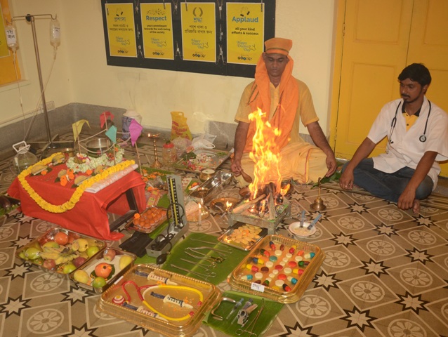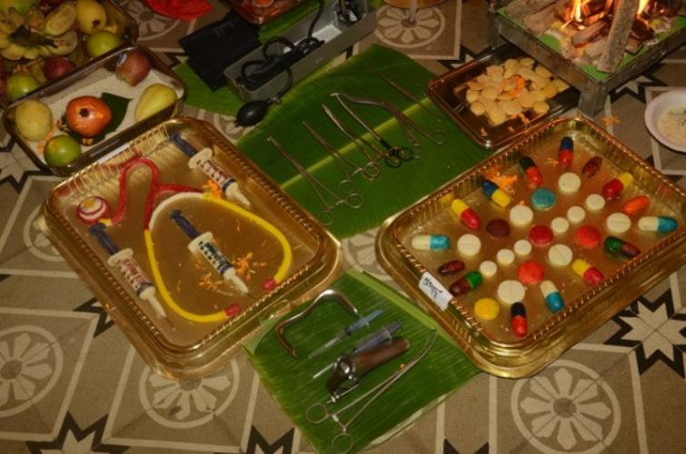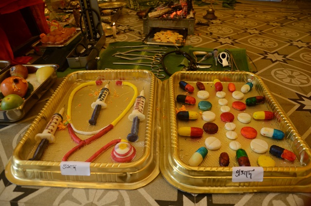 The puja was performed fully conforming to the traditions but had a touch of medical world feel with sweets offered in the shape of tablets and capsules and so on.
