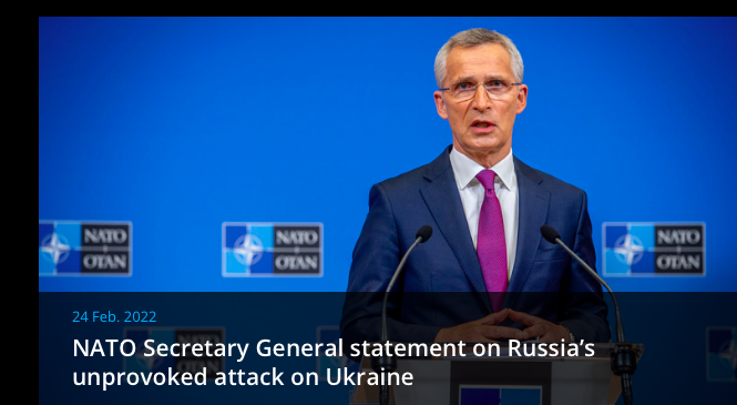 NATO Secretary General Jens Stoltenberg said: I strongly condemn Russia’s reckless and unprovoked attack on Ukraine, which puts at risk countless civilian lives. Once again, despite our repeated warnings and tireless efforts to engage in diplomacy, Russia has chosen the path of aggression against a sovereign and independent country.