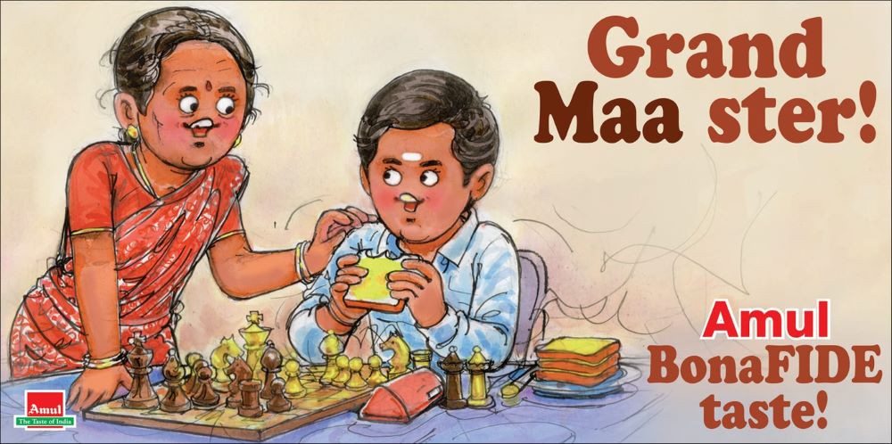 His mother stood beside him in the image. With a clever wordplay, the poster read, "Grand Maa Ster!" at the top and "BonaFIDE Taste!" at the bottom. Amul's caption highlighted the silent yet significant role of R. Praggnanandhaa's mother in contributing to his success in chess.