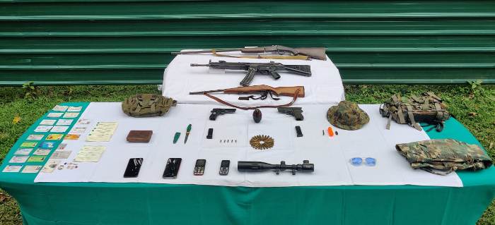 Security personnel recovered one HK assault rifle with magazine, one point 22 mm rifle, one SB rifle, one hand grenade, two pistols, assorted ammunition, extortion slips and other warlike stores in possession from them.