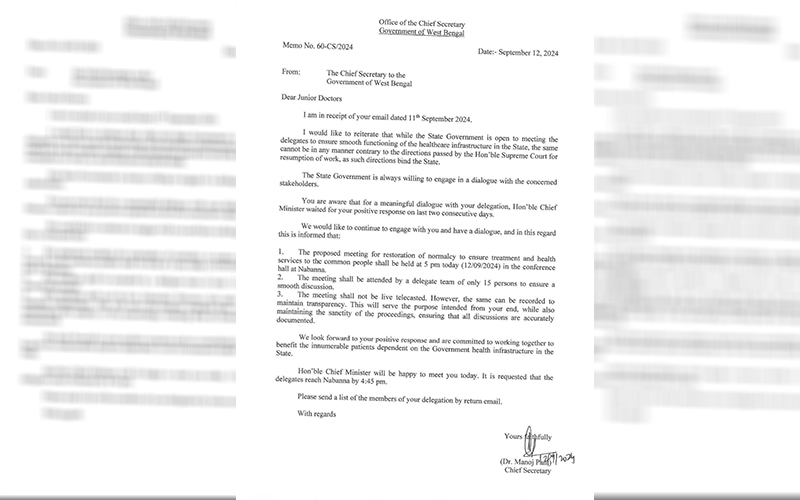 In an email to the Chief Minister on Tuesday, the West Bengal Junior Doctors' Front outlined six main points they want discussed. They also criticized the government’s email, calling it an "insult," as it was sent from the Health Secretary’s ID, one of the officials whose resignation they are demanding.
