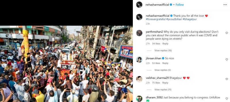 Bollywood actor Neha Sharma has recently participated in a roadshow in Bihar which has taken the internet by storm.