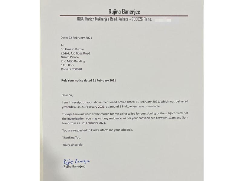 Responding to the notice, Rujira Banerjee on Monday informed the Central probe agency that she will be available for the interrogation on Tuesday (Feb 23) between 11 am. and 3 pm.