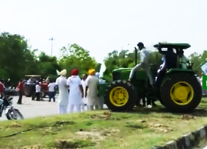 Farmers blocked the road with their tractors after a mahapanchayat in Pipli village in the region, trashing the relief announced by the Chief Minister.
