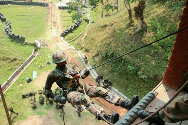 The exercise involved insertion of troops by slithering from helicopters and destroying a terrorist hide out.