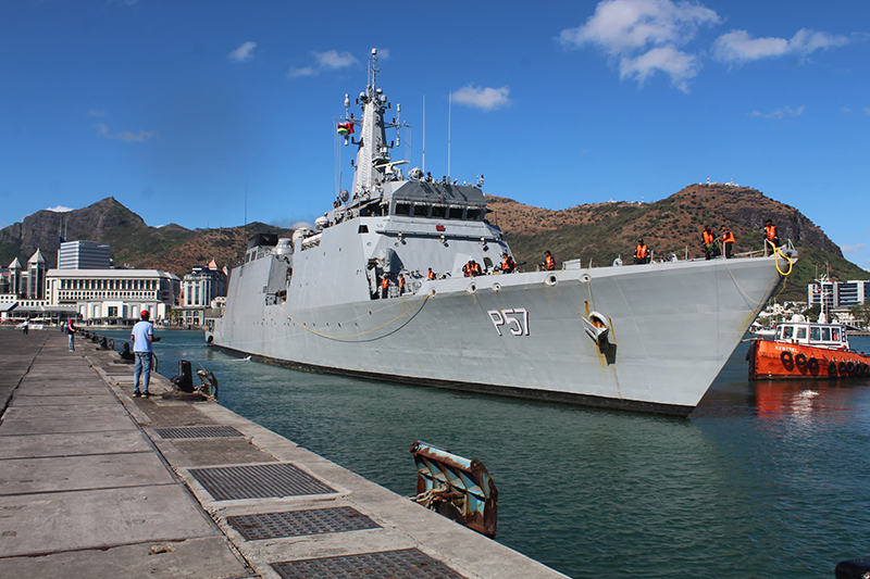 Prior entering harbour, the ship was engaged in maritime surveillance of Mauritian EEZ along with Mauritius Coast Guard (MCG) Ship Barracuda and MPF Dornier.