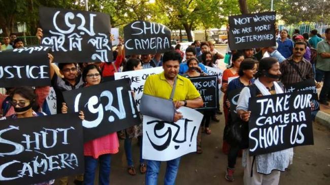 Wearing black bands on arms and covering their mouths with black scarfs, hundreds of city's journalists, cameramen and photojournalists took part in the protest rally which started from Mahatma Gandhi Statue area, near Kolkata Press Club, and ended at Esplanade crossing.