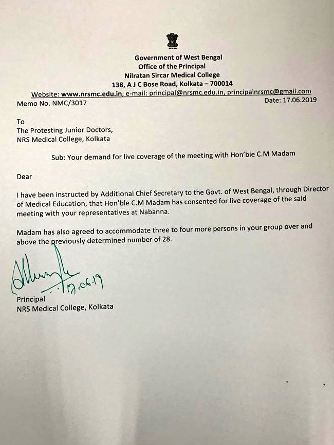 Dropping the demand of media coverage, the West Bengal government had earlier sent a letter to the protesting junior doctors and urged two representatives from each medical college of the state to meet Banerjee at 3 pm.