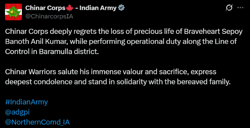 Chinar Corps- Indian Army posted on X, "Chinar Corps deeply regrets the loss of precious life of Braveheart Sepoy Banoth Anil Kumar, while performing operational duty along the Line of Control in Baramulla district.