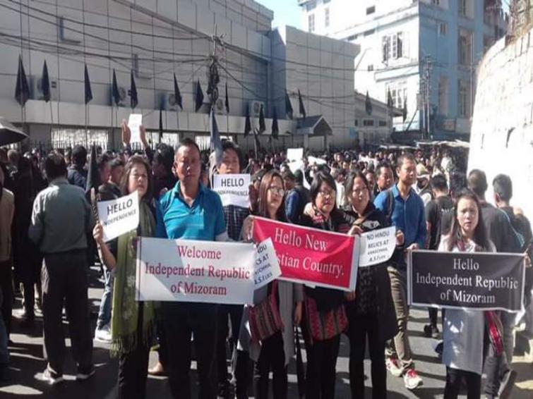 Waving black flags, the protesters also held placards which read, ‘Welcome Independent Republic of Mizoram’, ‘Hello New Christian Country’.
